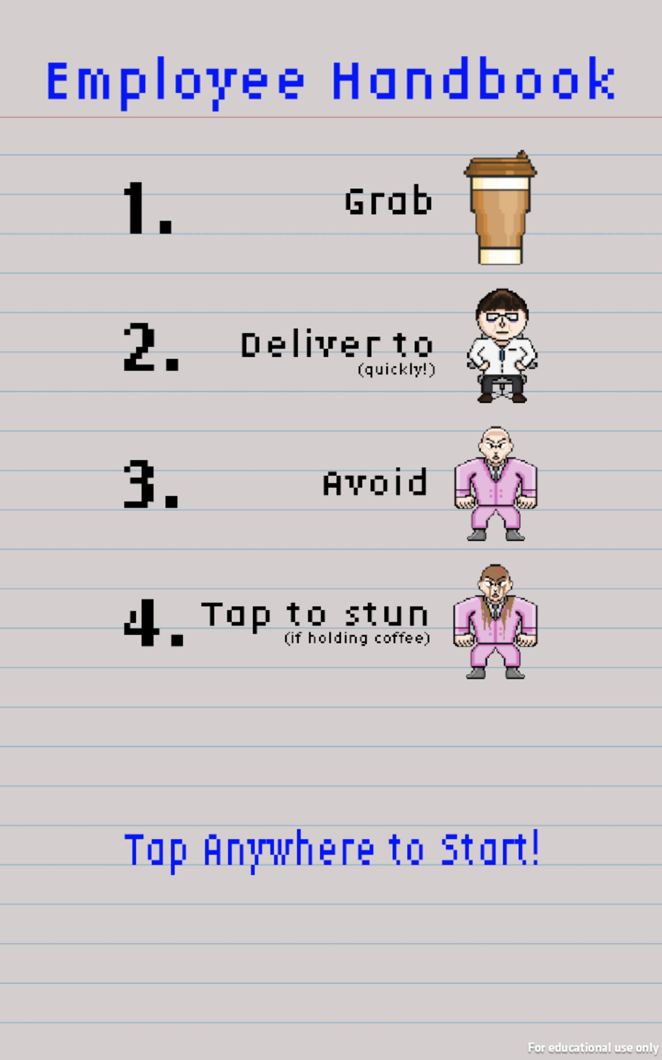 Coffee Time is an retro arcade style game built specifically for mobile. Inspired by classics like Pac-Man and Burger Time. Move your character through a maze-like office, delivering coffee to your coworkers. Watch out for the big boss- if you run into him, you're fired! As you deliver more coffee, you’ll be promoted and more bosses will spawn. Go for the high score!